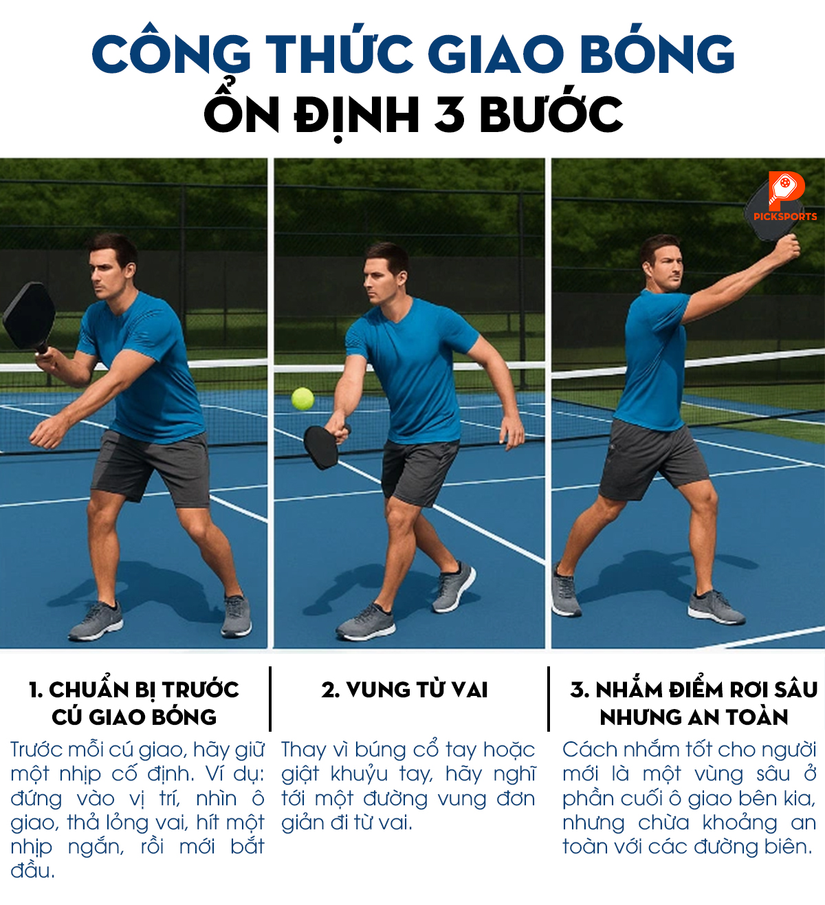 Cách giao bóng Pickleball ổn định hơn không bắt đầu từ động tác đẹp, mà bắt đầu từ một công thức rất thực tế: giao đúng luật, giữ routine cố định, vung đơn giản từ vai và nhắm vùng sâu an toàn. Khi bạn bỏ bớt sự cầu toàn ở từng cú và bắt đầu đo bằng tỷ lệ bóng vào, cú giao sẽ lên rất nhanh. Giao bóng tốt không phải cú giao mạnh nhất, mà là cú giao bạn dùng được lặp lại trong cả trận.
