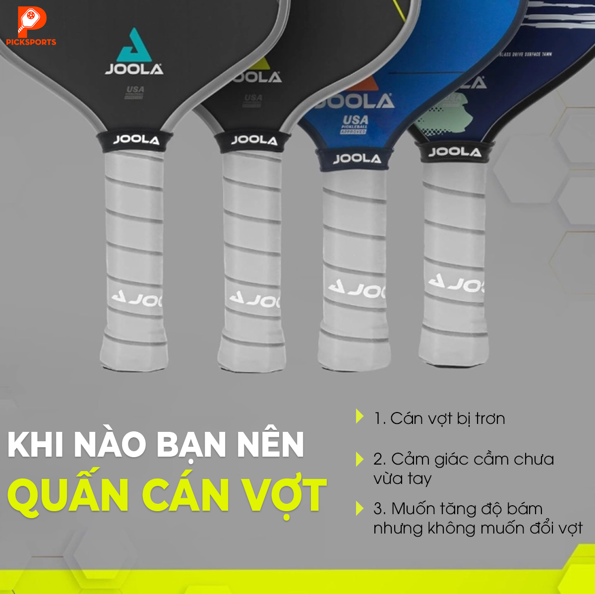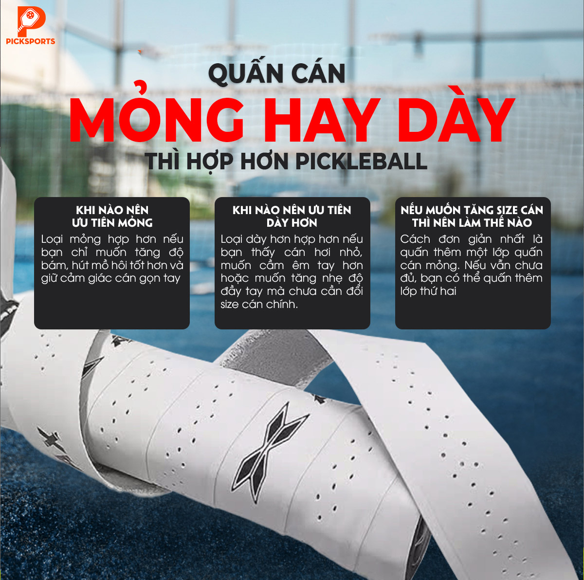 > Nếu cán vợt của bạn đang trơn hoặc cầm chưa vừa tay, xem ngay danh mục Phụ kiện Pickleball để chọn quấn cán phù hợp.