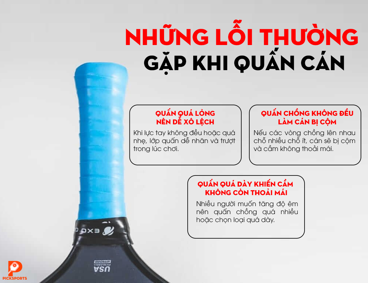 Nếu các vòng chồng lên nhau chỗ nhiều chỗ ít, cán sẽ bị cộm và cầm không thoải mái. Cách khắc phục là giữ góc quấn ổn định từ đầu tới cuối.