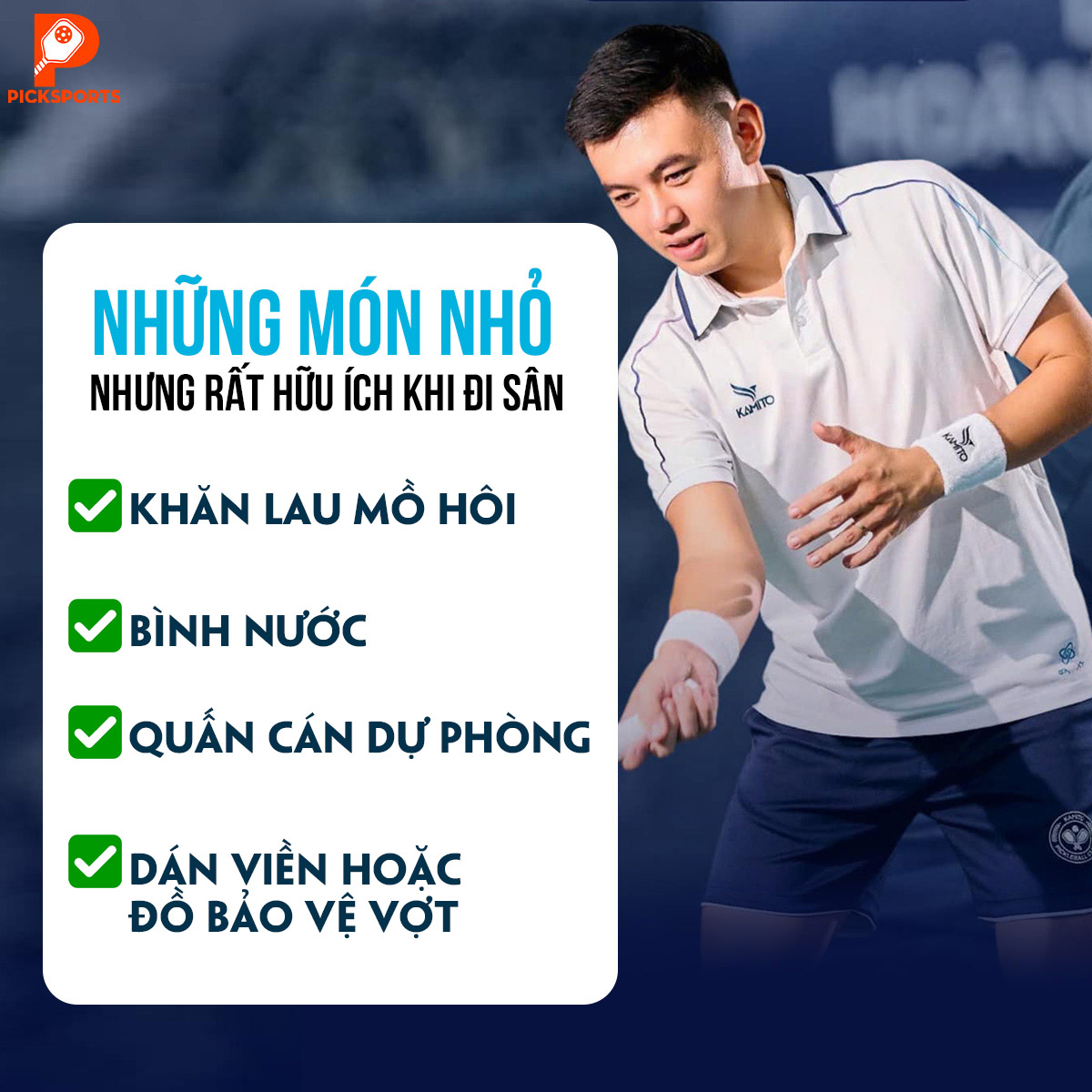 Khăn là món rất cơ bản nhưng nên có. Khi chơi ngoài trời hoặc chơi lâu hơn, khăn giúp bạn lau tay, lau mặt và giữ cảm giác cầm vợt ổn hơn.