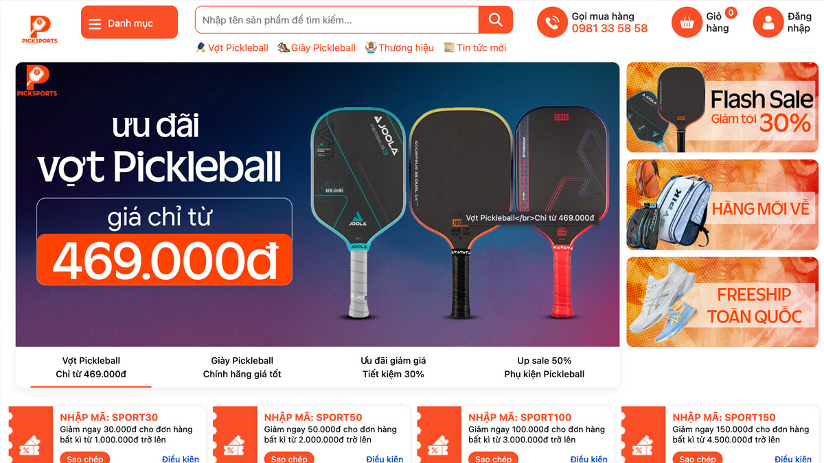 Điểm mạnh lớn nhất của PickSports là sự chuyên mảng Pickleball. Website không đi lan man mà bám khá chặt vào hệ sinh thái Pickleball. Nhờ vậy, người mua dễ hình dung đây là nơi để tìm vợt Pickleball, giày Pickleball, bóng Pickleball và phụ kiện Pickleball trong cùng một chỗ.